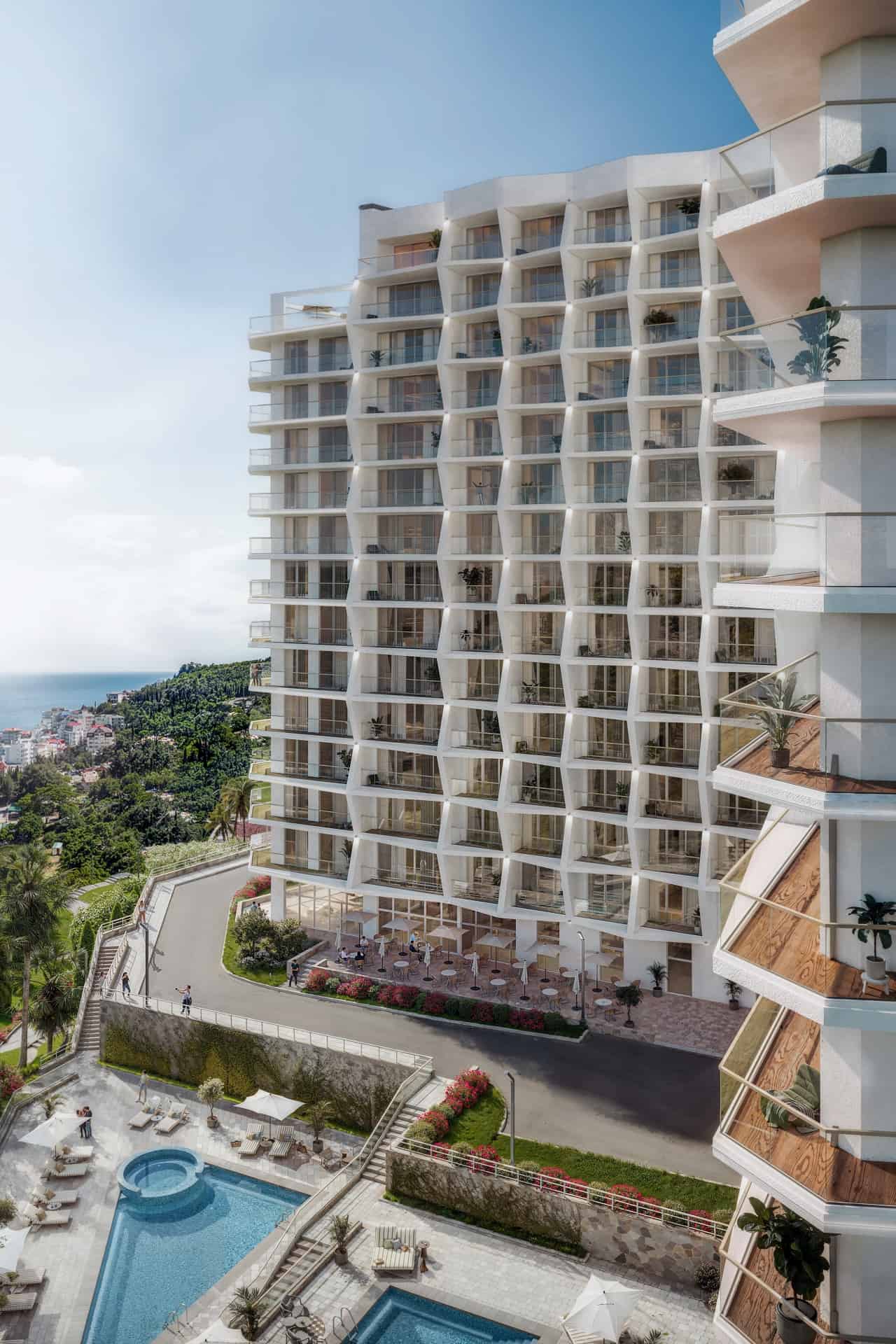 Архитектура LETTO - современное воплощение красоты и элегантности. Комбинация светлых фасадов и плавных форм создаёт неповторимую визуальную симфонию, завораживающую с первого взгляда. Стеклянное ограждение террас и обилие панорамного остекления создают ощущение невесомости и становятся палитрой для отражения самых ярких красок окружающей природы.