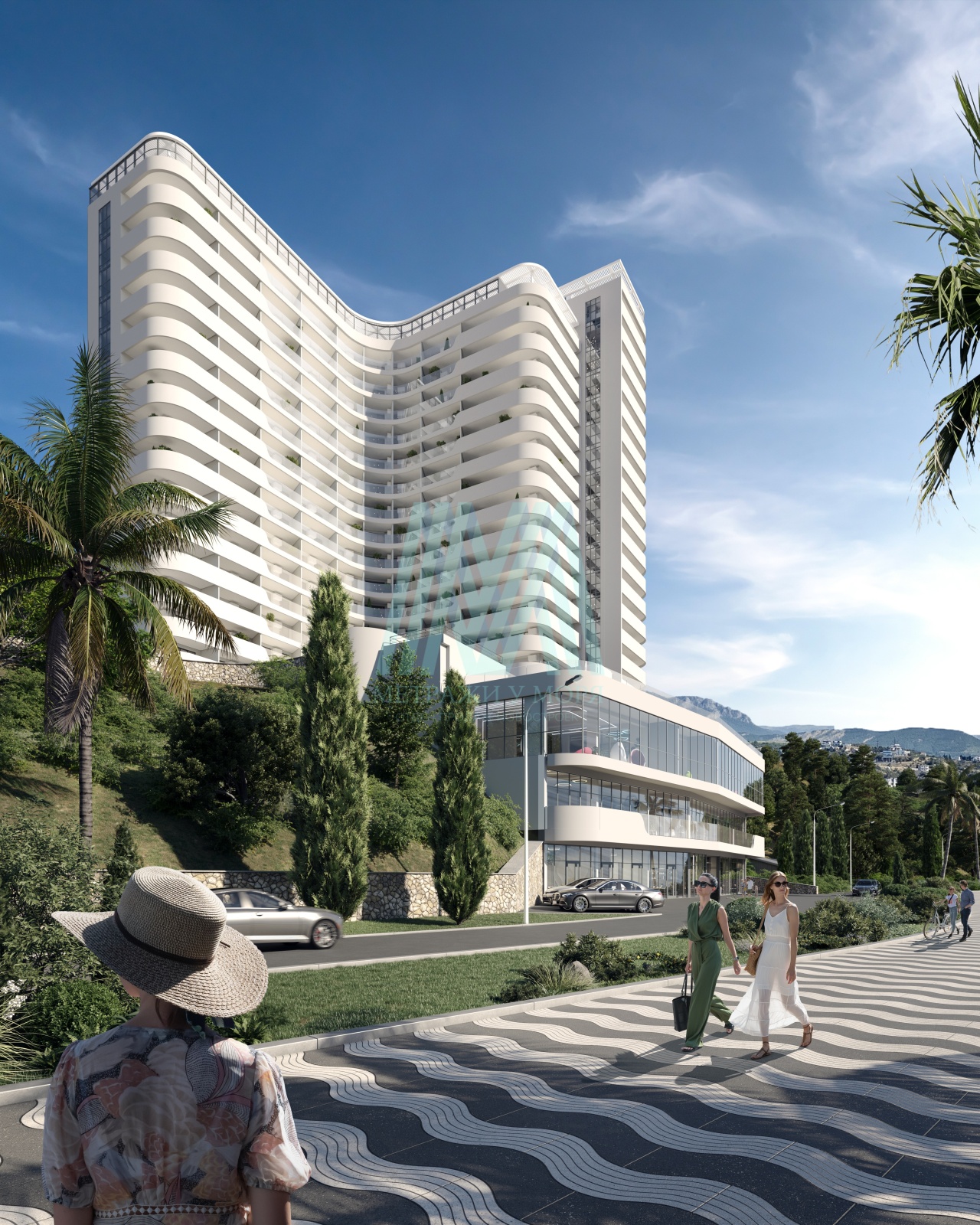 Комплекс «Море Плаза» (More Plaza) в Алуште отличается современной архитектурой. В проекте сочетаются точная геометрия фасадов и спокойные природные оттенки в отделке общих пространств.