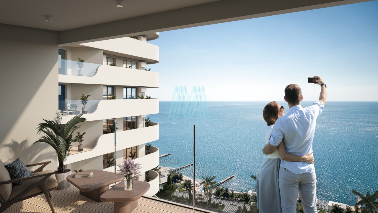 Панорамные окна в апартаментах с просторными открытыми балконами, из которых открываются виды на море с бирюзовой гладью.