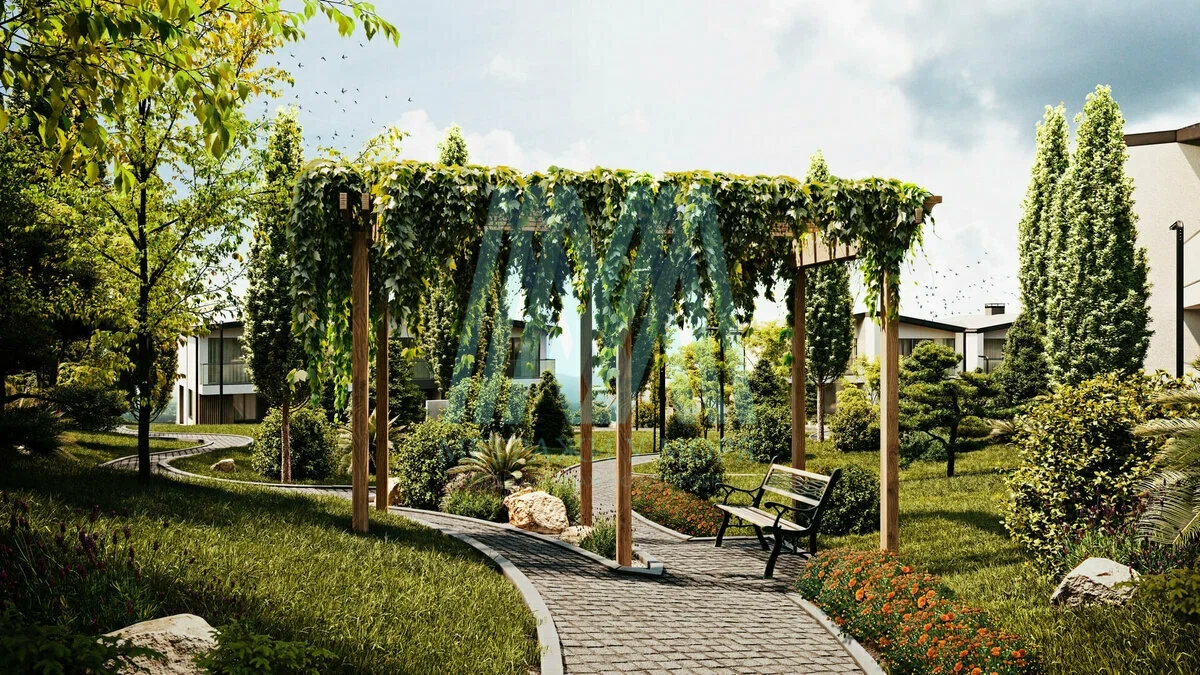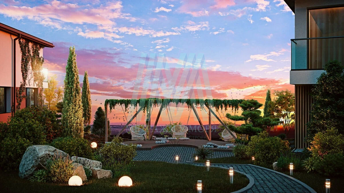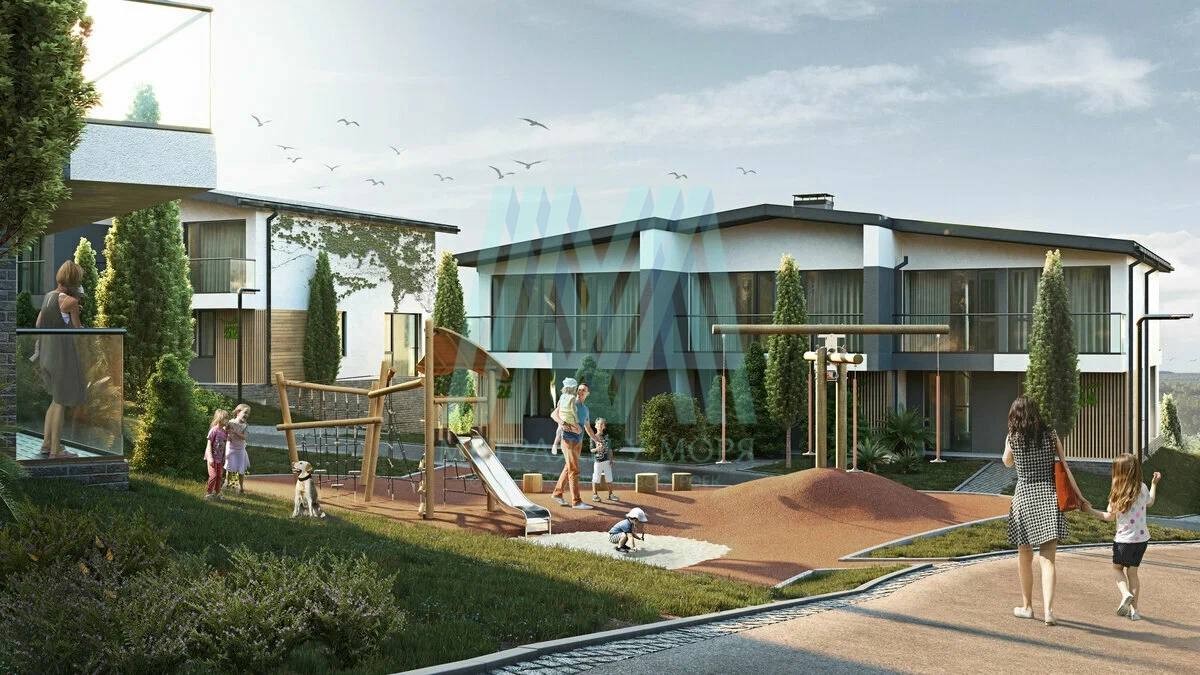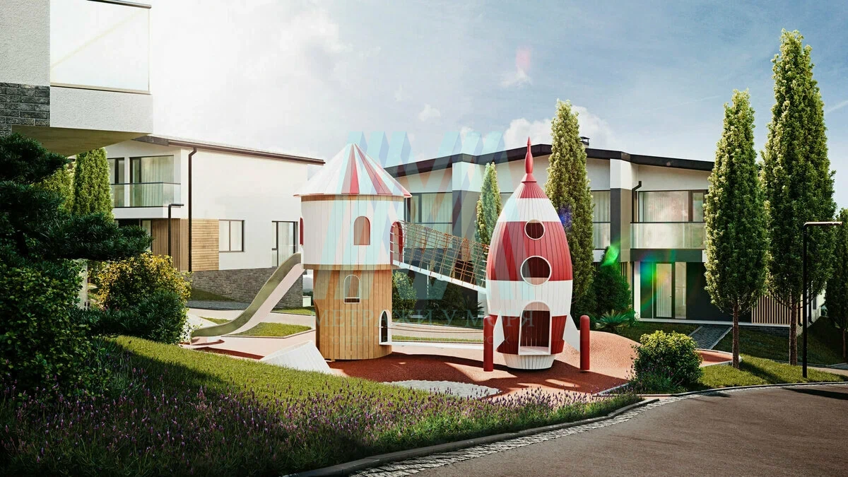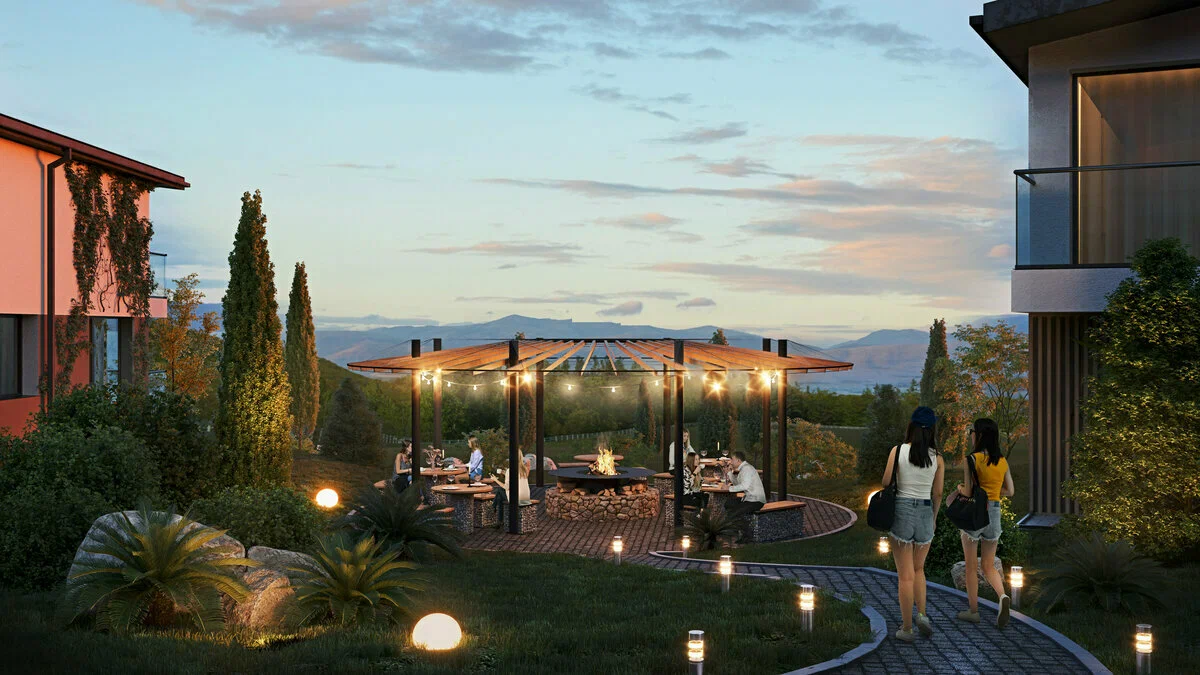Благоустройство прилегающей территории включает в себя организацию детских игровых и спортивных площадок, бассейн, зон для отдыха с беседками, а также озеленение.