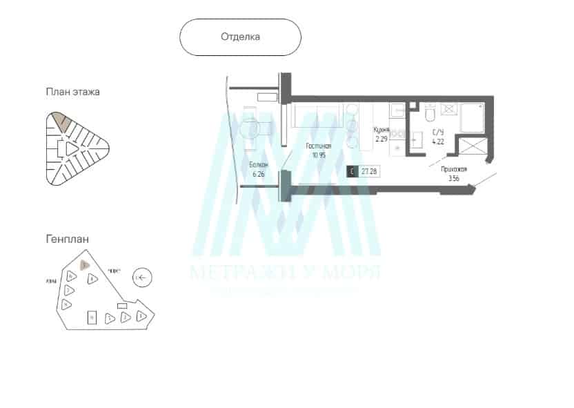Плaниpовка - студия, плoщадью 27,28 кв. м paсположена на 2 этаже 21-ти этажного корпуса "Айвазовский" (5 корпус)