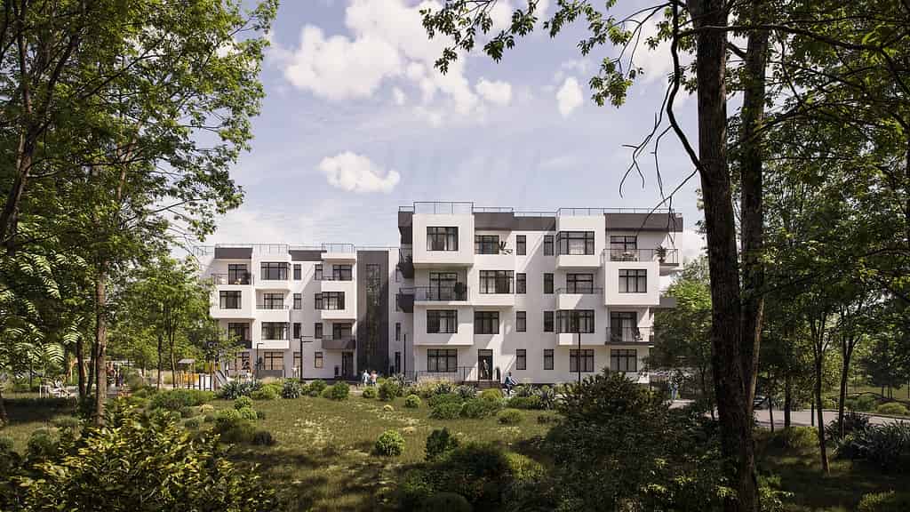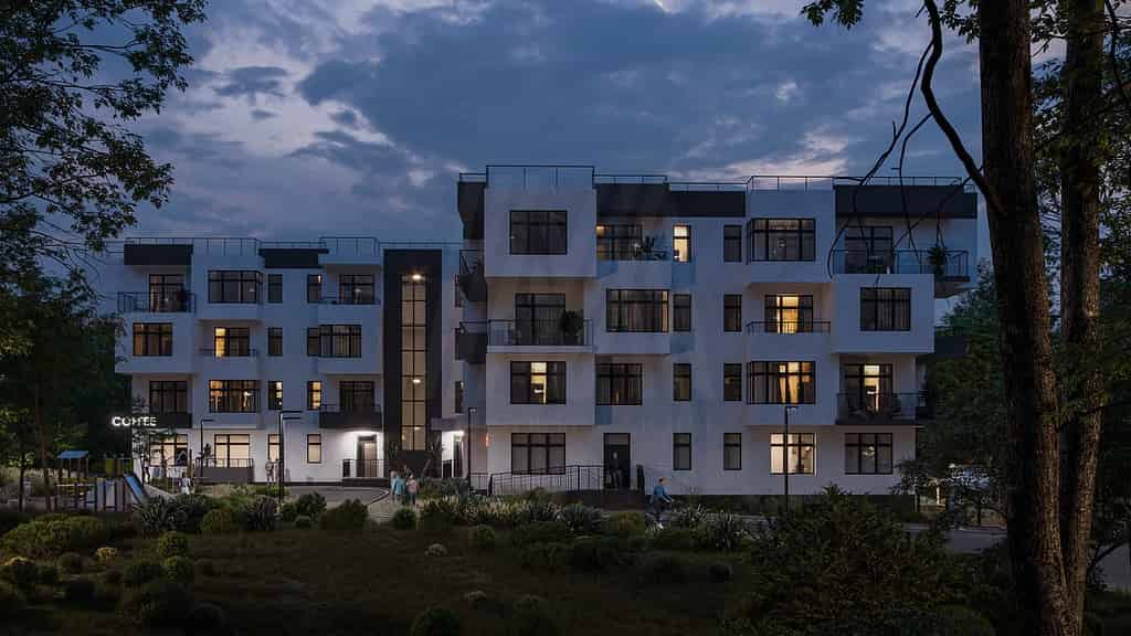 Комплекс отличается авторской архитектурой в скандинавском стиле: минимализм, сдержанные цвета фасада благородных природных оттенков, панорамное остекление.