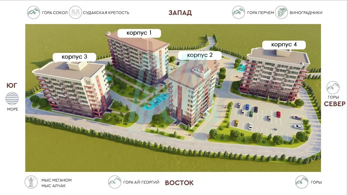 Четыре восьмиэтажных дома, расположенных в тихом районе города Судак в пешей доступности к инфраструктуре города.