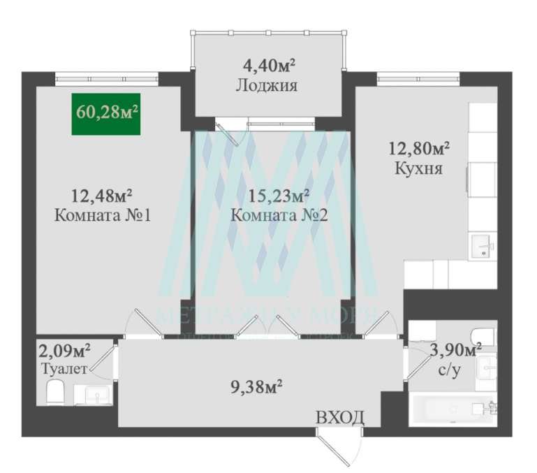 2-к квартира ЖК "Гриновский" 60,28 кв.м.