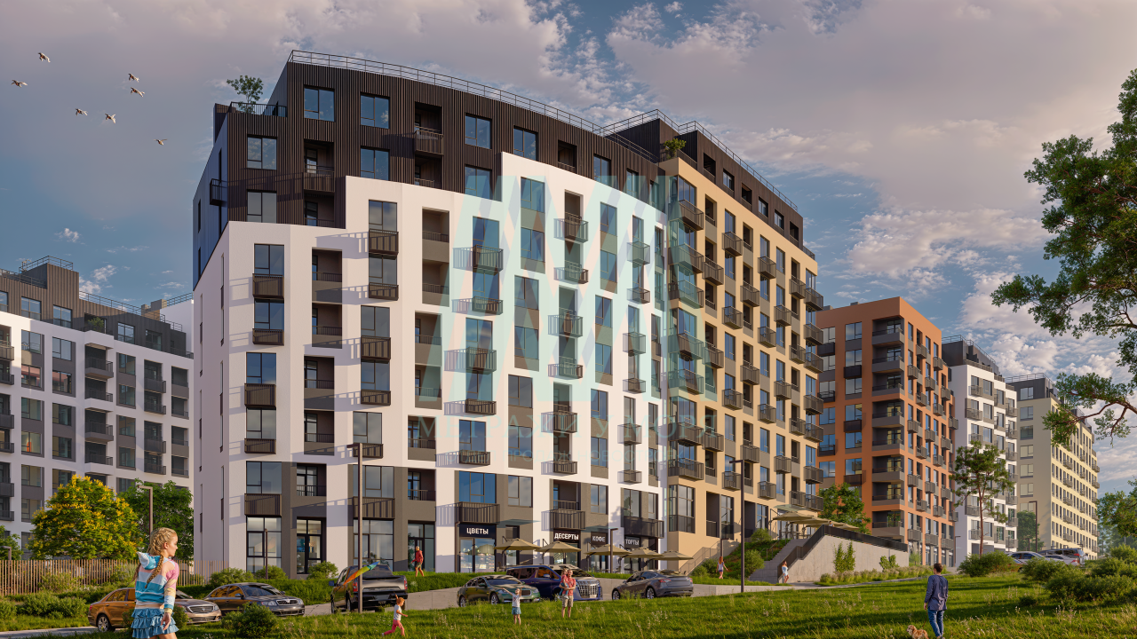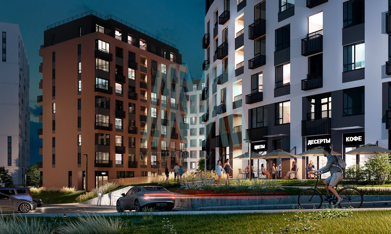 - На первых этажах с внешней стороны запроектирована зона коммерции, а с внутренней, выходящей во двор — квартиры с собственными террасами.
