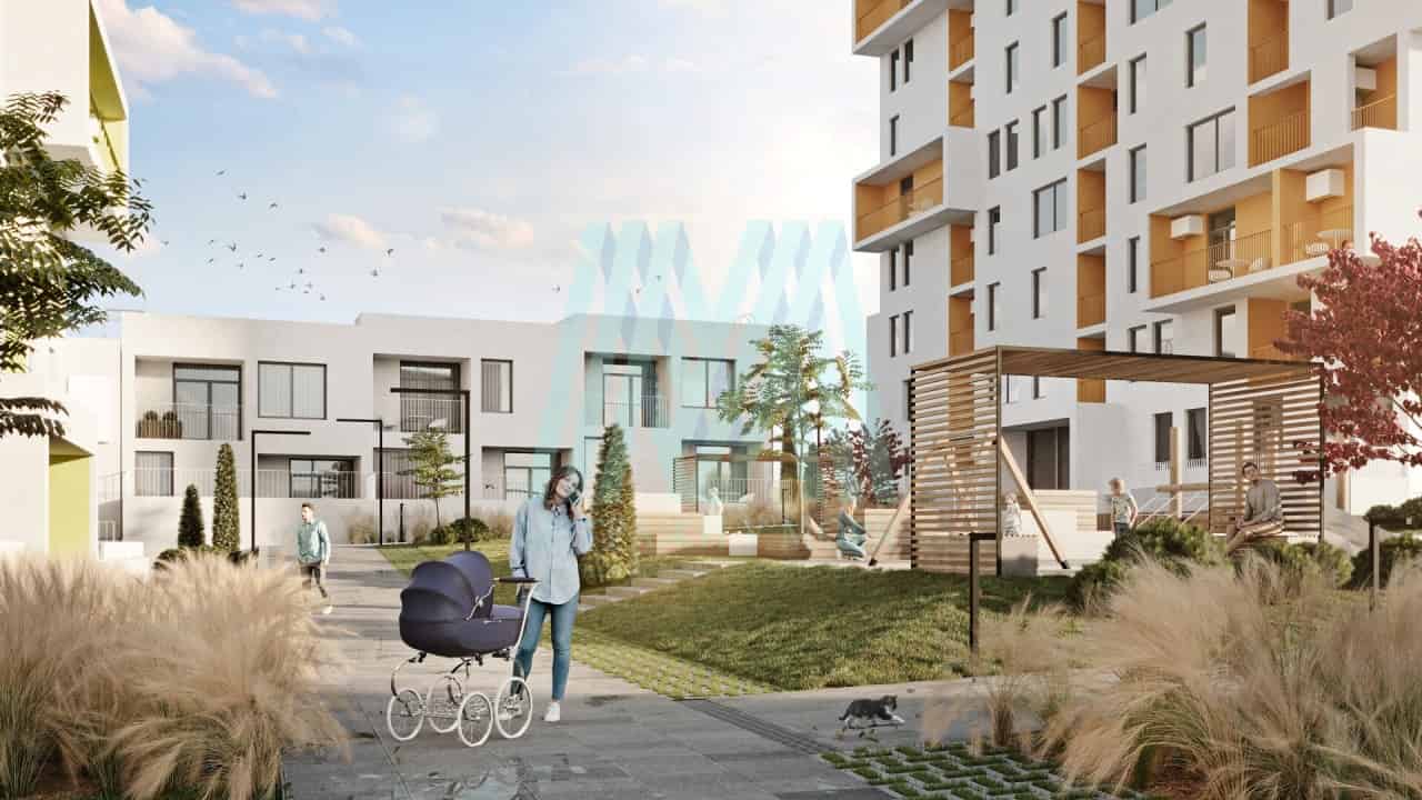 Благоустройство территории: внутренний двор ухожен и благоустроен, здесь есть зелёные газоны, кустарники и деревья. Для отдыха предусмотрены зоны с перголами. Для детей оборудованы современные площадки с качелями, горками и игровыми элементами.