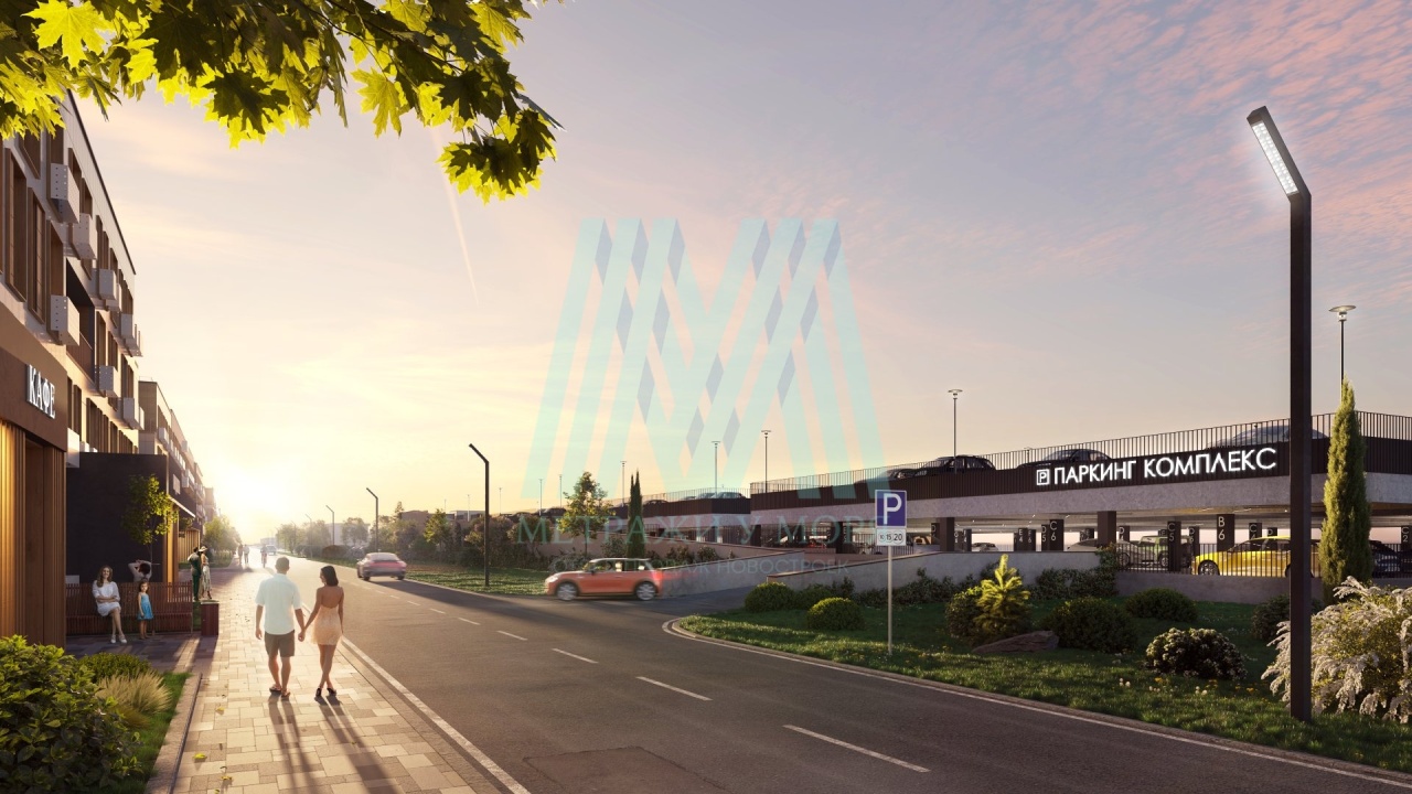 - Променадная аллея-парк — доминанта микрорайона, главная пешеходная улица с театральной площадкой, велодорожкой, лаунж и йога-зонами.
