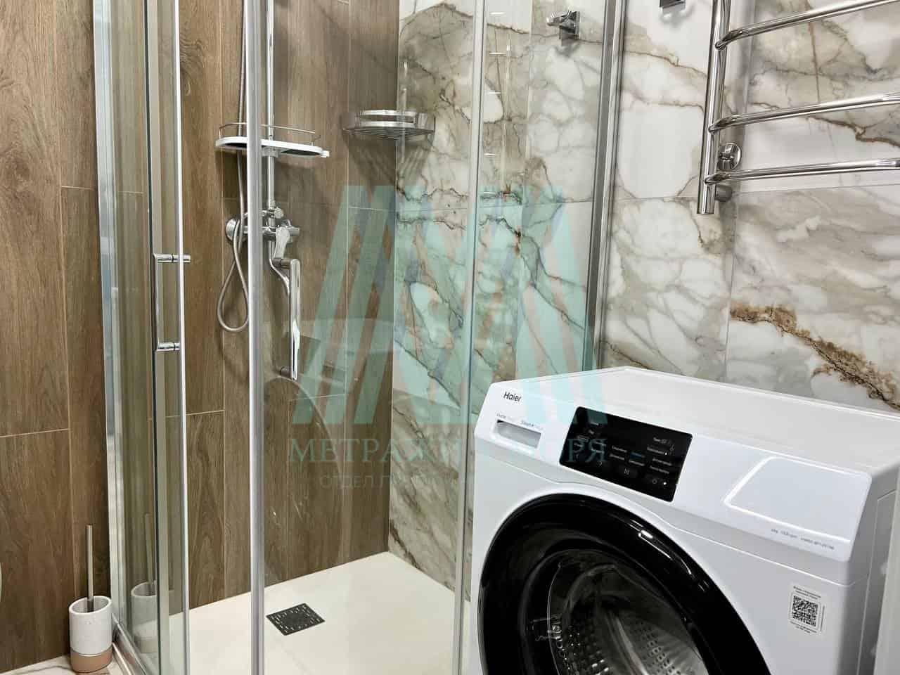 В кухонной зоне установлена подсветка и дополнительное освещение. Теплые полы в комнате, коридоре и в ванной комнате. В ванной установлена стиральная машина,фен, душевая кабина, зеркало с шкафчиком и подсветкой. Установлена видеокамера.