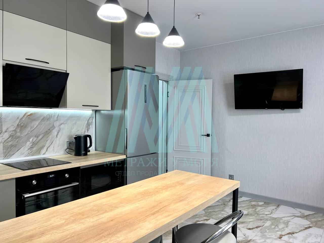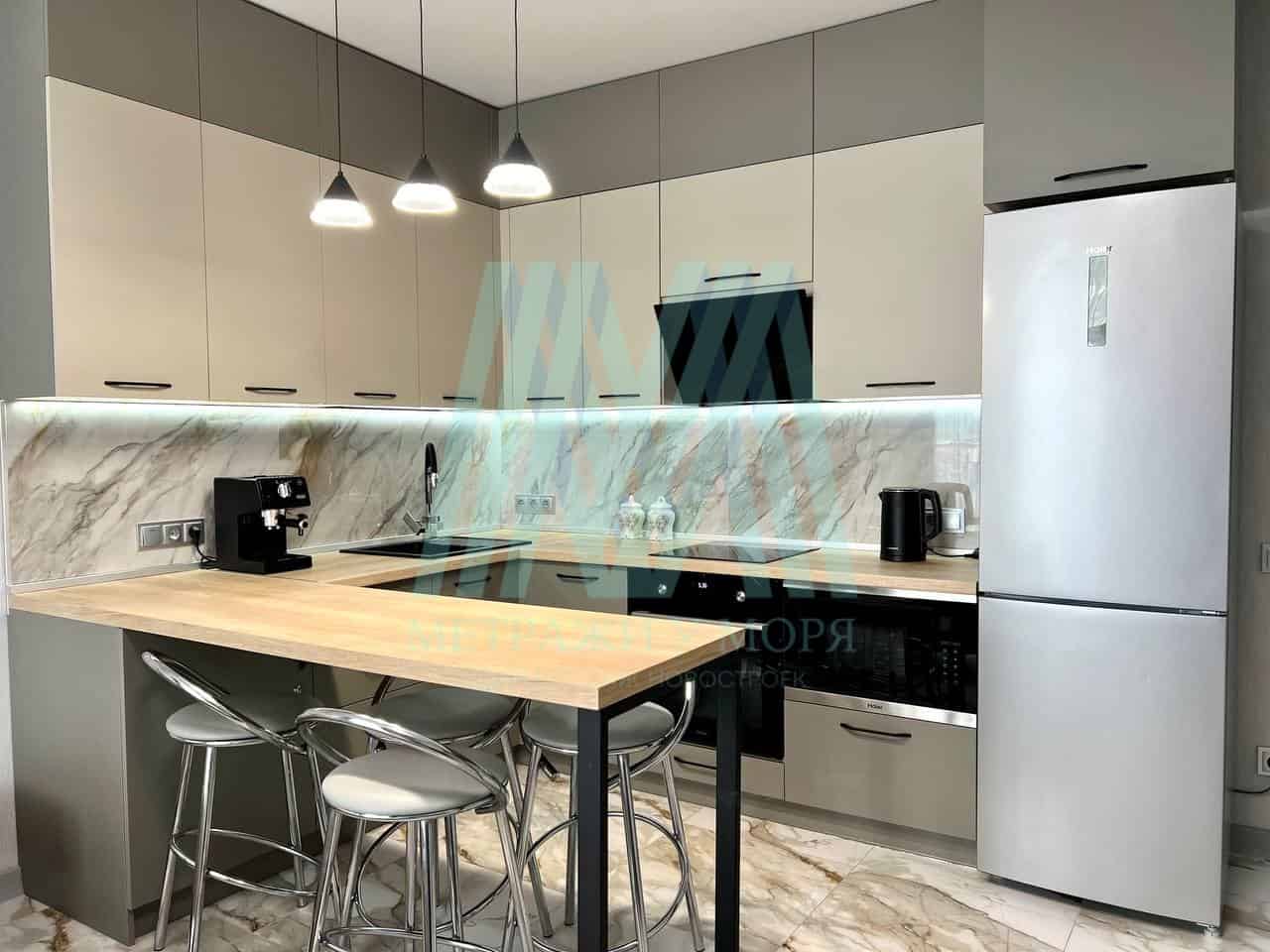 Апартамент полностью укомплектован необходимой для проживания мебелью и техникой. Мебель выполнена из качественных современных материалов, все дверцы оборудованы доводчиками. Из техники установлено: встраиваемая микроволновка, духовой шкаф, индукционная печь, холодильник и телевизор, также установлен отдельный кран для питьевой воды.
