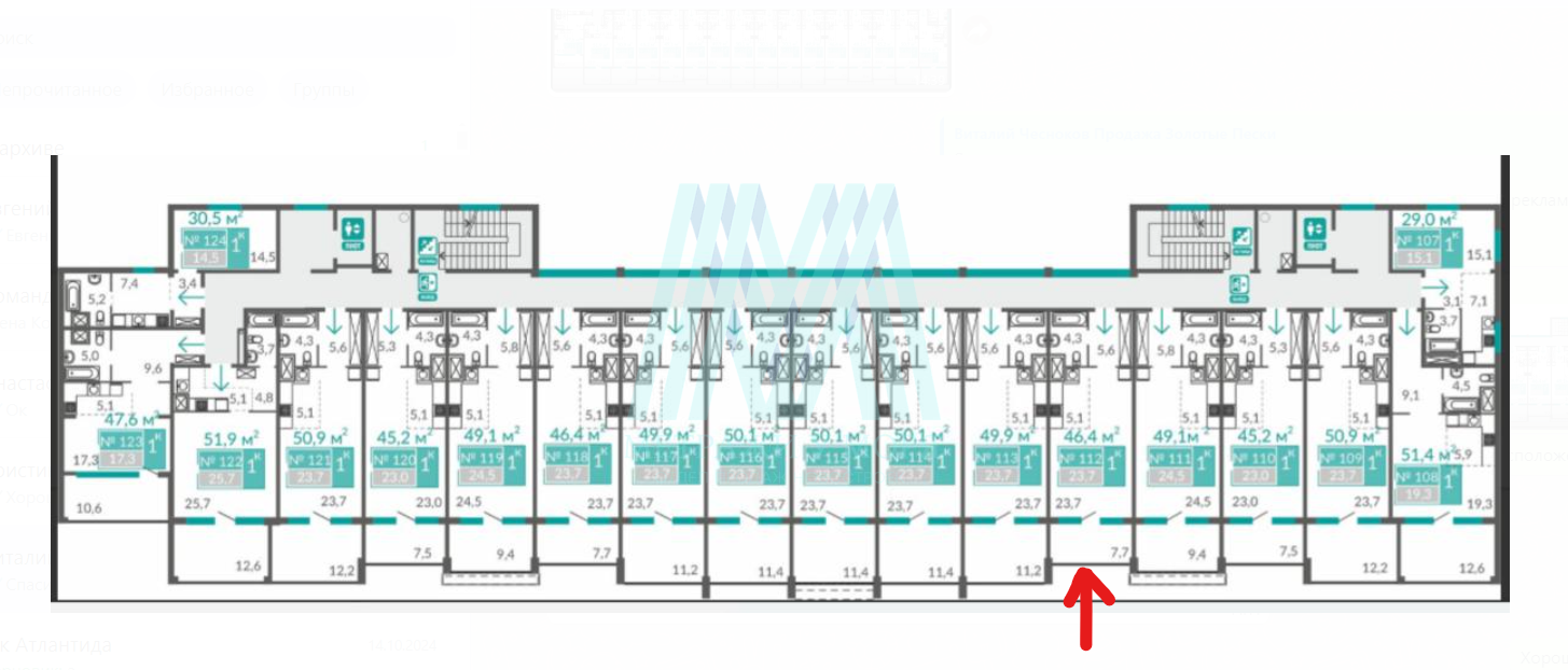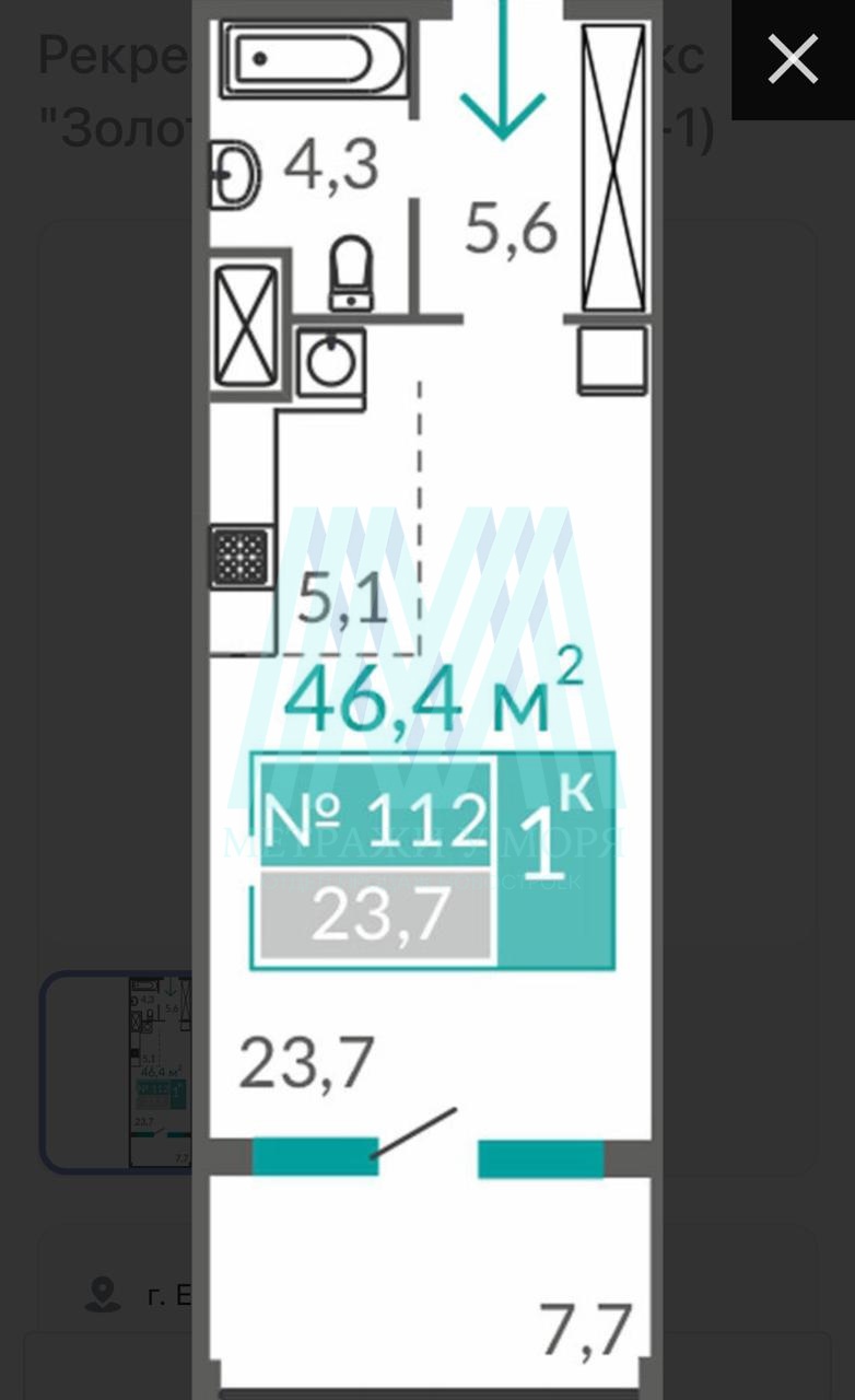 Апартамент общей площадью 46.4 кв.м. расположен на 7 этаже 9-ти этажного здания. С просторного балкона данного апартамента открывается завораживающий вид на Черное море!
