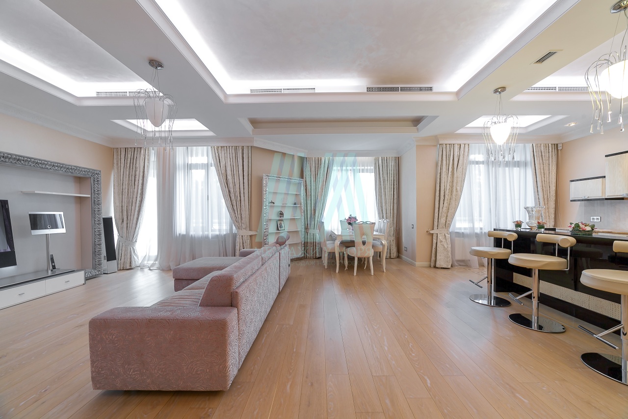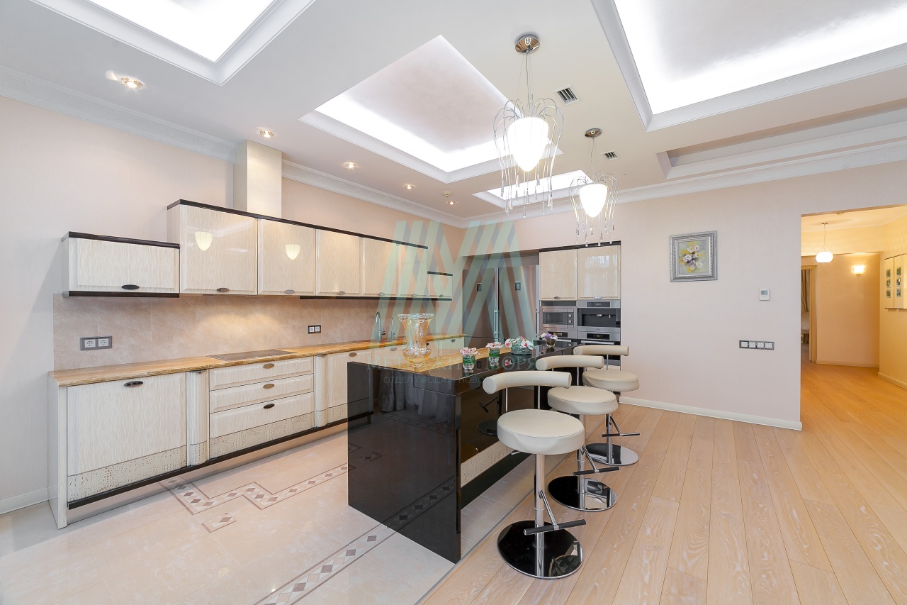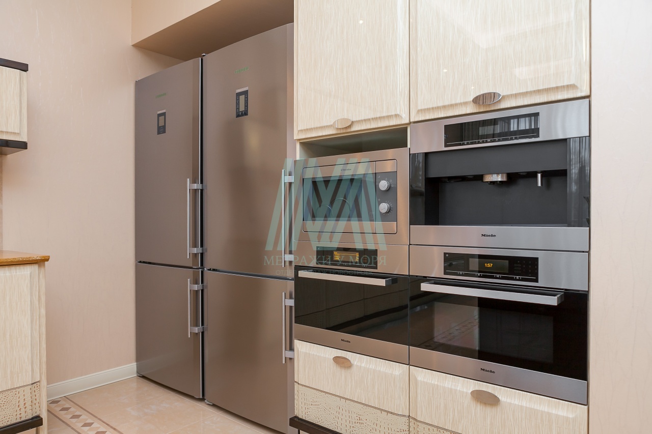 В гостиной огромный угловой диван с контейнером ведущего итальянского бренда, специализирующегося на производстве диванов-АLТЕRNОТТI. Есть домашний кинотеатр, с колонками и ретранслятором звука, который обустроен в ванне фирмы Lоwе. Кухня представлена ведущим итальянским брендом Тurri, модель Gеnеsis. Имеется два больших холодильника LIЕВНЕЕR, один из которых с ледогенератором. Так же имеется: пароварка с духовкой Мiеlе, встроенная кофемашина Мiеlе, варочная поверхность комби электро-индукция Мiеlе, микроволновая печь Siеmеns. В зоне столовой красивый обеденный стол и шесть стульев, подвесная открытая витрина итальянского бренда МÓWI.