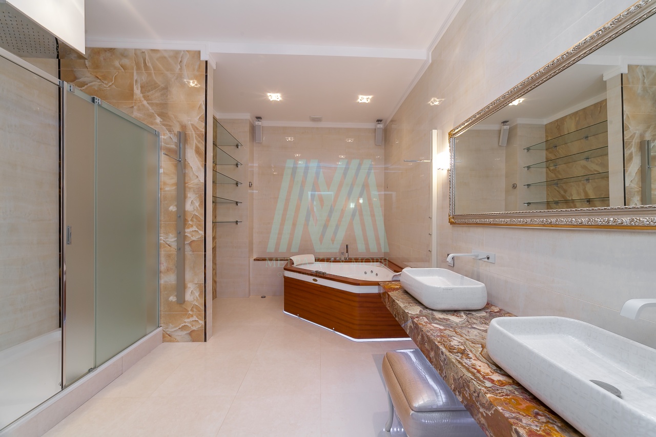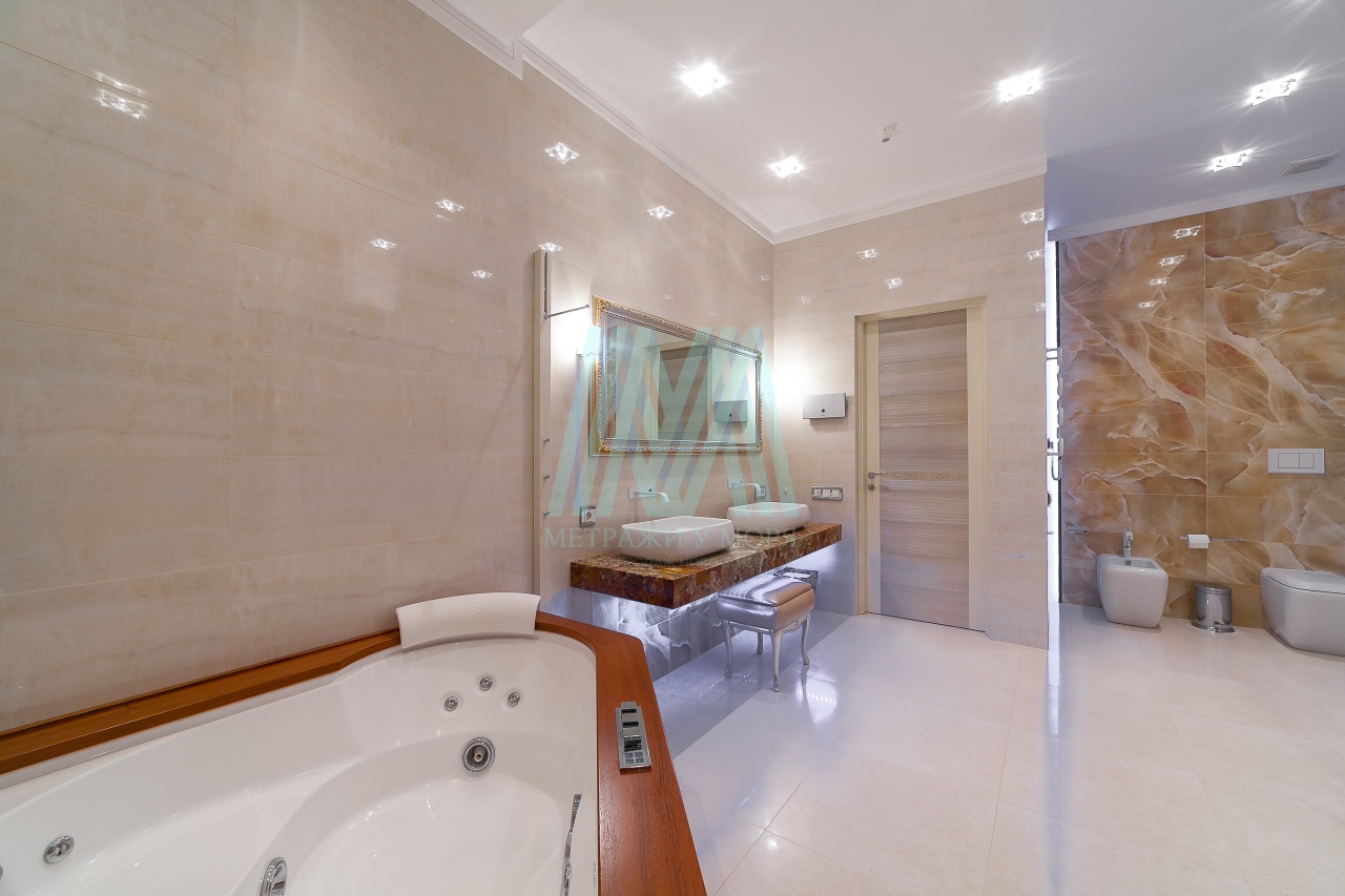 Основной санузел включает в себя огромную ванну фирмы Jасuzzi с гидромассажем, самоочисткой и подсветкой, обшитой деревом. Огромная душевая кабина и сантехника,