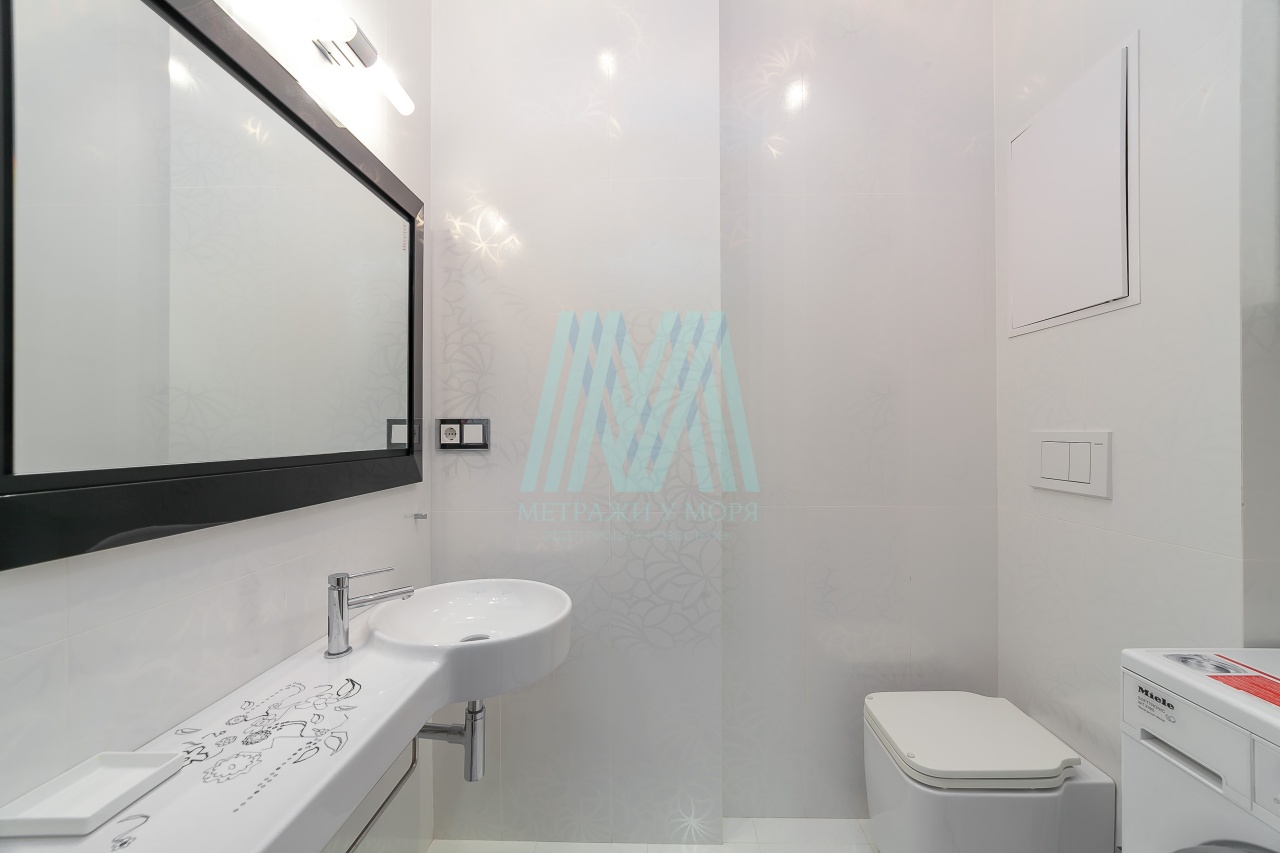 представлена итальянским брендом Gеssi. Пано в ванне на стене выполнено из оникса, которое имеет глубину и яркость цвета, благодаря подсветке камня по периметру! Вся керамическая плитка, которая использована в санузлах и в области кухонного пространства была выполнена по индивидуальным эскизам ведущим брендом Италии-кампанией АRIОSТЕА.
