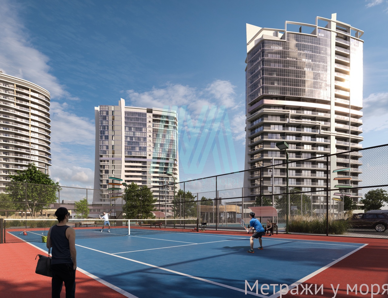Спортивная инфраструктура. Включает теннисные и падел-корты, вейк-парк и зону пляжного волейбола.