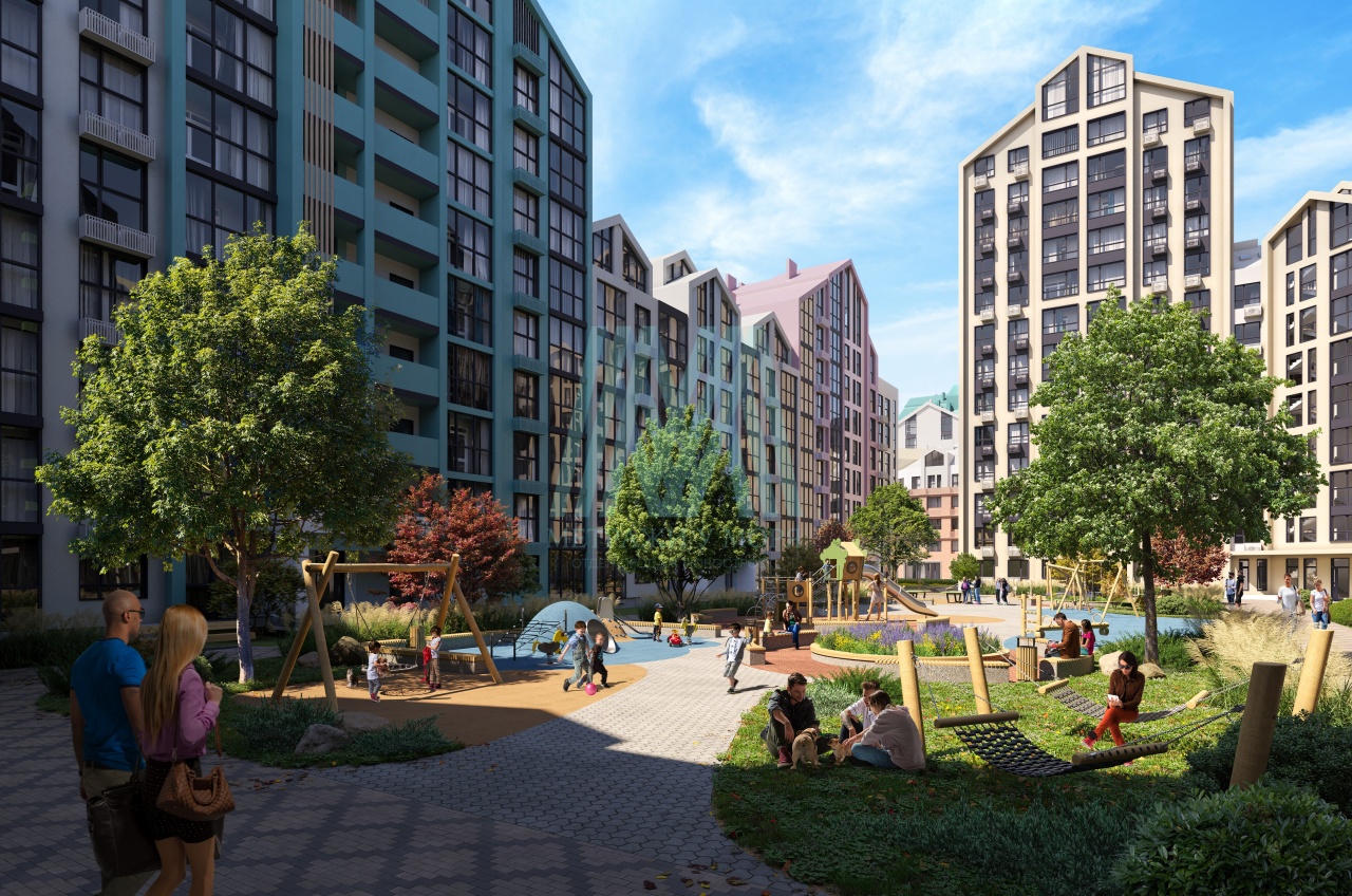 Через весь комплекс пройдёт пешеходный бульвар. На территории будут закрытые от машин дворы, воркаут-зоны, площадки для детских игр, спортивных занятий и йоги.