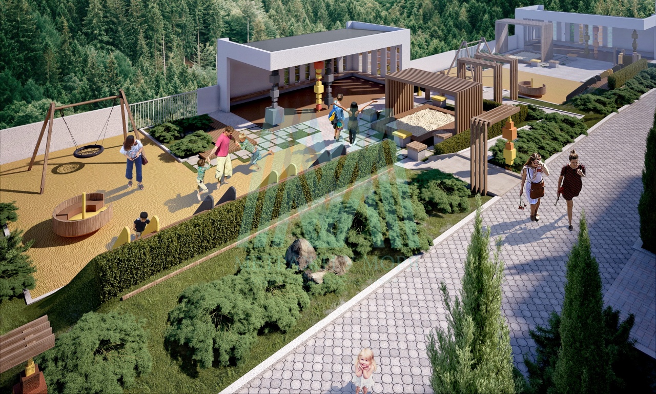В самом сердце комплекса предусмотрено строительство современной школы на 900 мест и двух детских садов на 380 малышей. Торговые галереи предусмотрены для следующих групп: супермаркеты, банк, аптека, магазин фермерской продукции, спортзал, фитнесс-центр, тренажерный зал, бассейн, детский развивающий клуб, кофейня, салон красоты, школа раннего развития деток, всё это создаст комфортную среду для жителей нашего микрорайона.