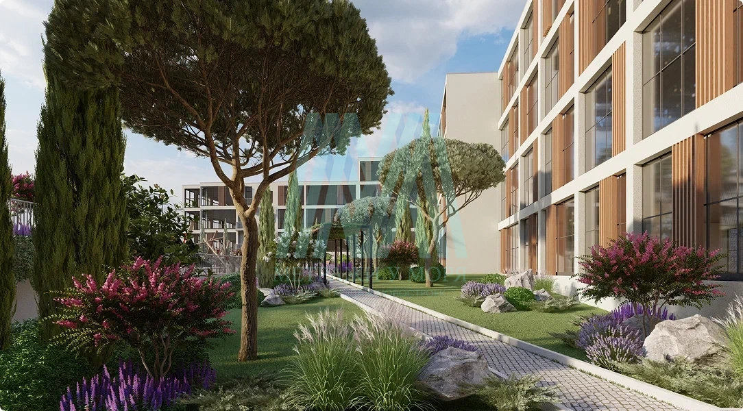 Закрытая благоустроенная территория с ландшафтным дизайном. На территории высажено более 100 видов растений, среди которых туи, пальмы, сосны.