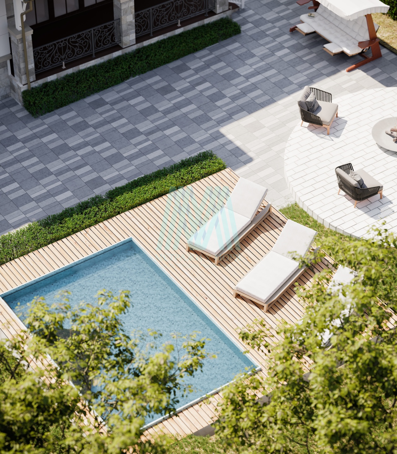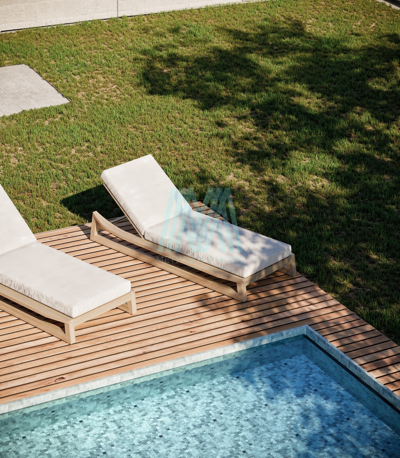 Спасительный уголок прохлады, так необходимый в пылкое летнее время. Здесь можно начать утро с освежающего заплыва или позволить себе впитывать ласковые солнечные лучи, расслабившись на уютных шезлонгах. Это идеальное место для веселой субботней вечеринки с друзьями и незабвенного воскресного утра в кругу семьи.