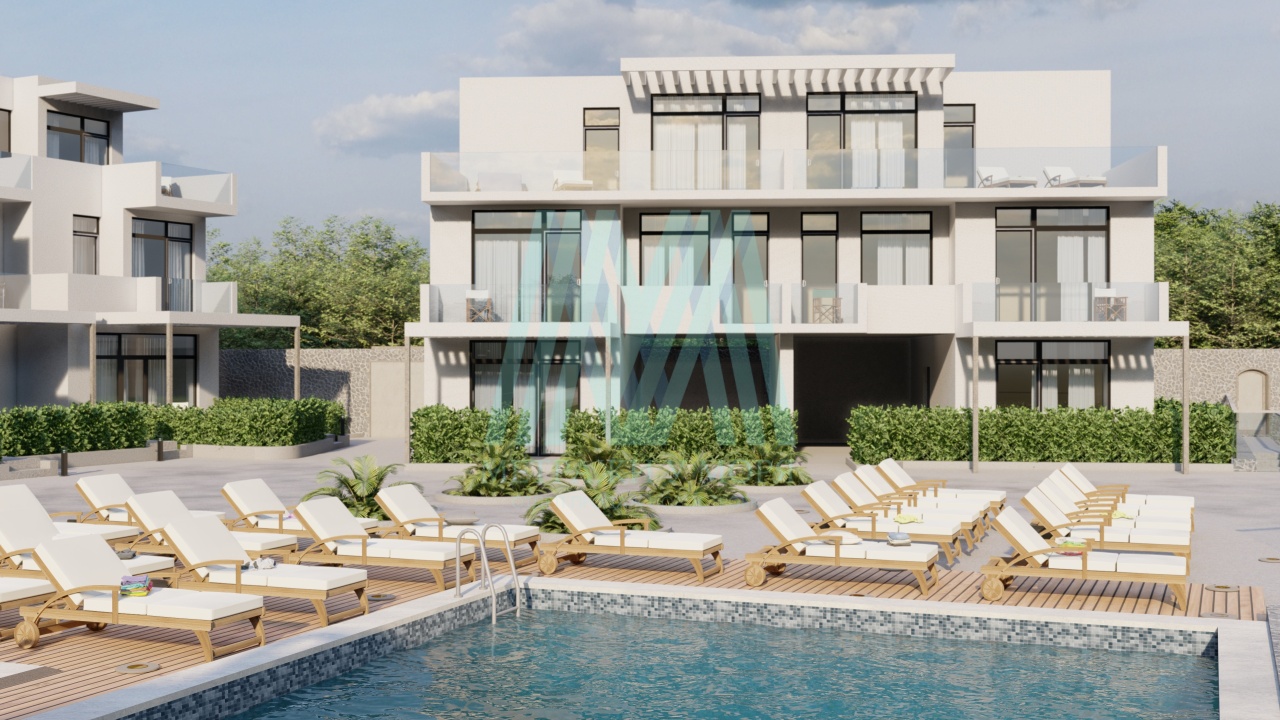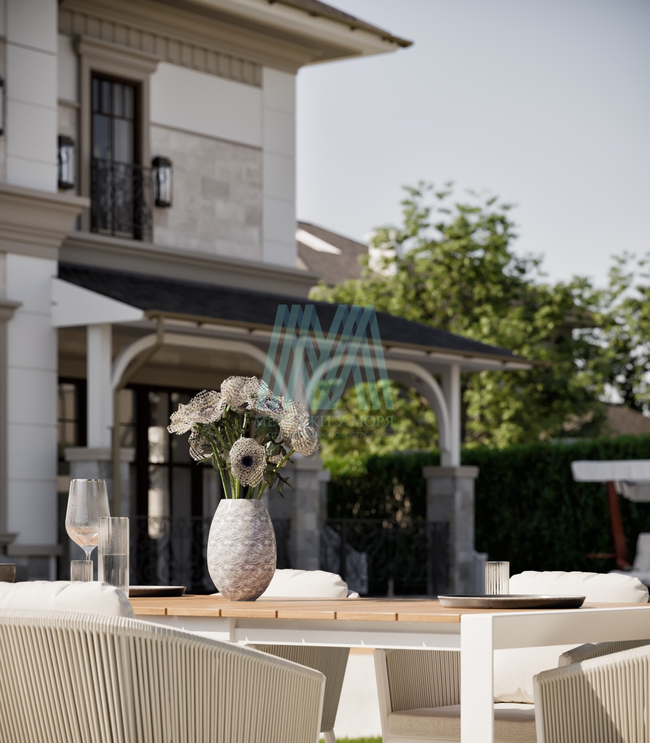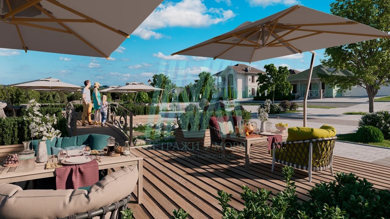 Террасы — с деревянными перголами, создают уют для отдыха на свежем воздухе.