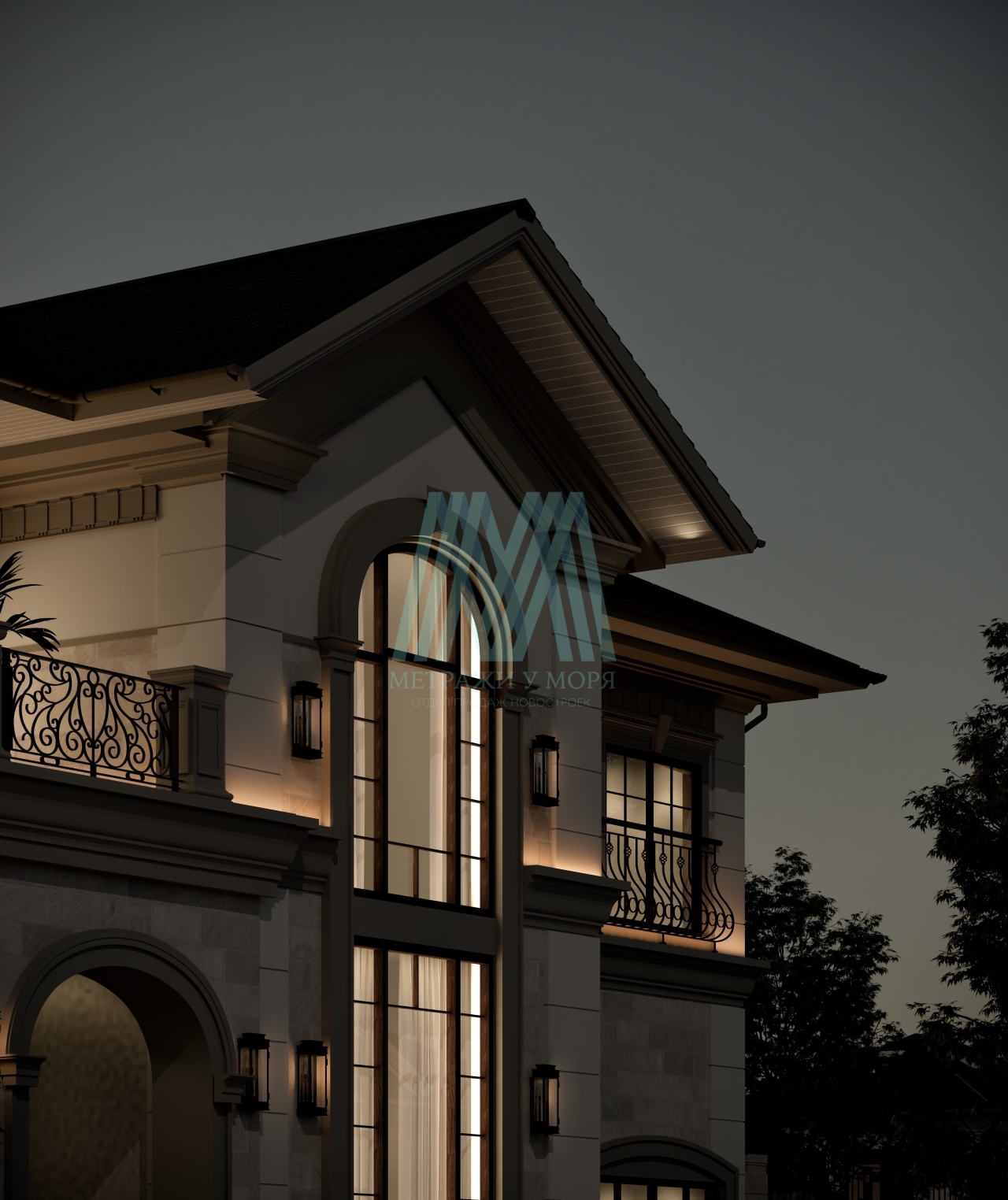 Фасады украшены декоративной штукатуркой и элементами из натуральных материалов.