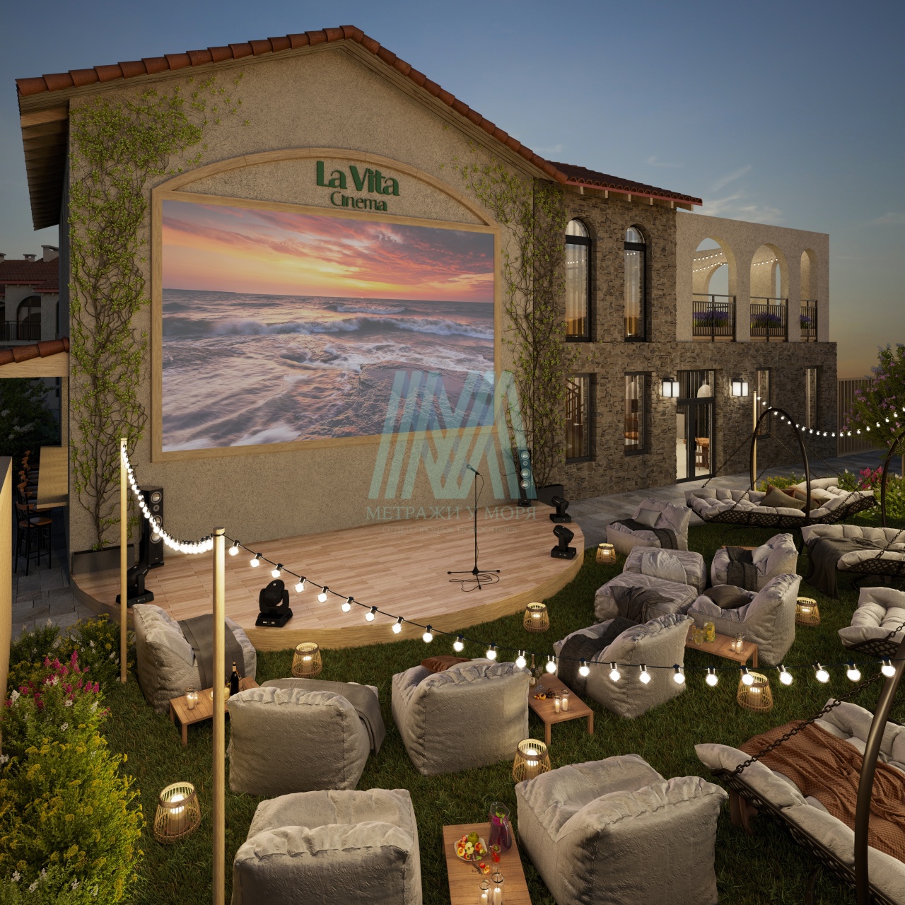 Почувствуйте тонкий аромат цветов и пение птиц, окунитесь в яркие краски южной природы. Вечер можно провести за просмотром фильма в летнем кинозале. Устройтесь поудобнее на уютной уличной мебели, наслаждайтесь фильмом в компании близких друзей или устройте показ любимых мультфильмов для детей.