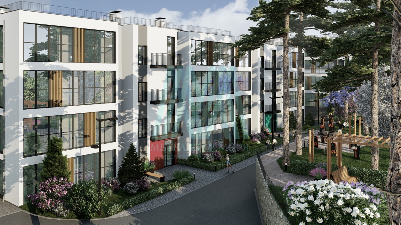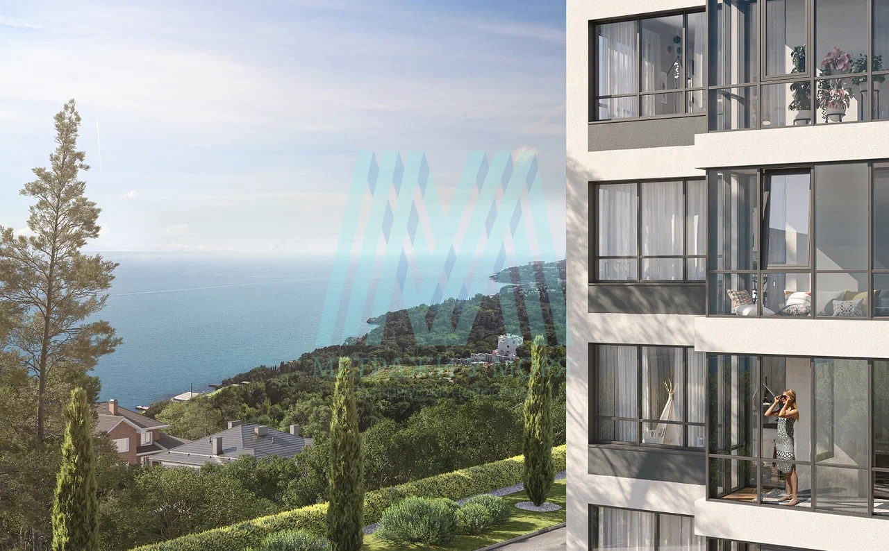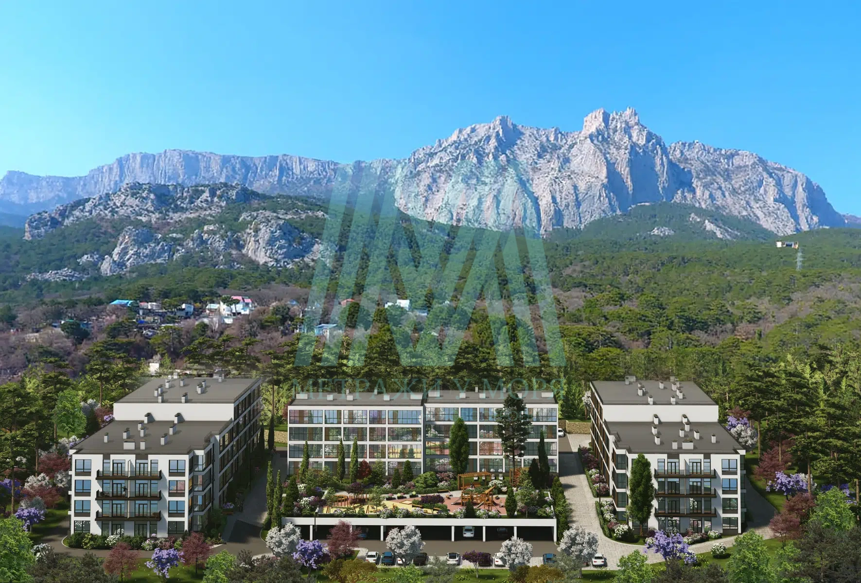 Современный жилой комплекс включает в себя три 4-х этажных здания на 184 квартиры и благоустроенную территорию, проект расположен в г. Алупка между двух величественных панорам: бескрайних просторов Черного моря и завораживающих горных вершин Ай-Петри.